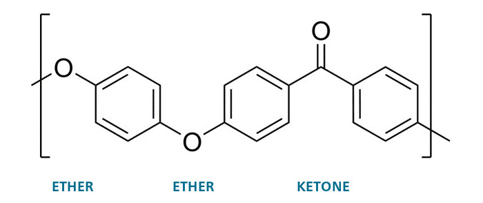 "Aromatic", usually meaning distinctive or sweet-smelling, may seem a strange word here, but scientists use it to describe some molecules containing or made from ring-like structures (like the aryl building block above). Small molecules of this type, like toluene & naphthalene, have distinct odours, hence the name. PEEK itself however – like most thermoplastics – is odourless under normal conditions. From a chemical point of view, PEEK is a largely linear, semi-crystalline polymer. Here’s how the building blocks fit together and thus we get Ether Ether Ketone or EEK: